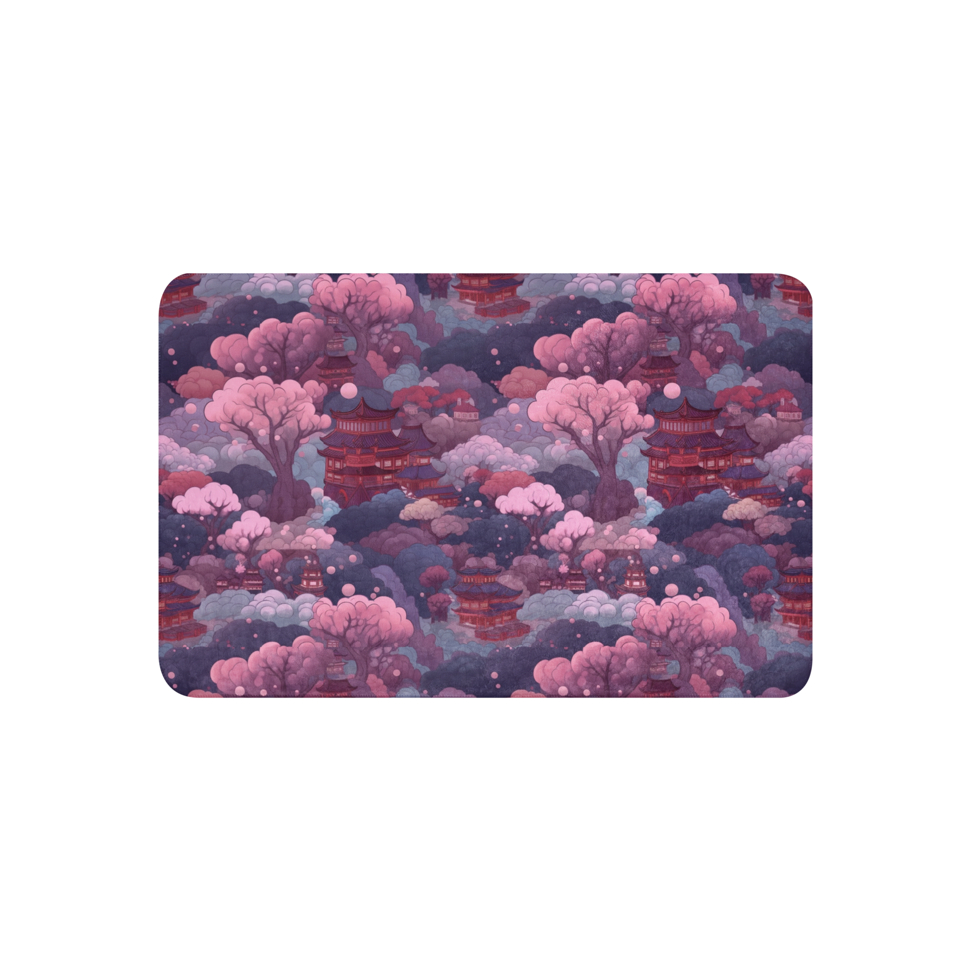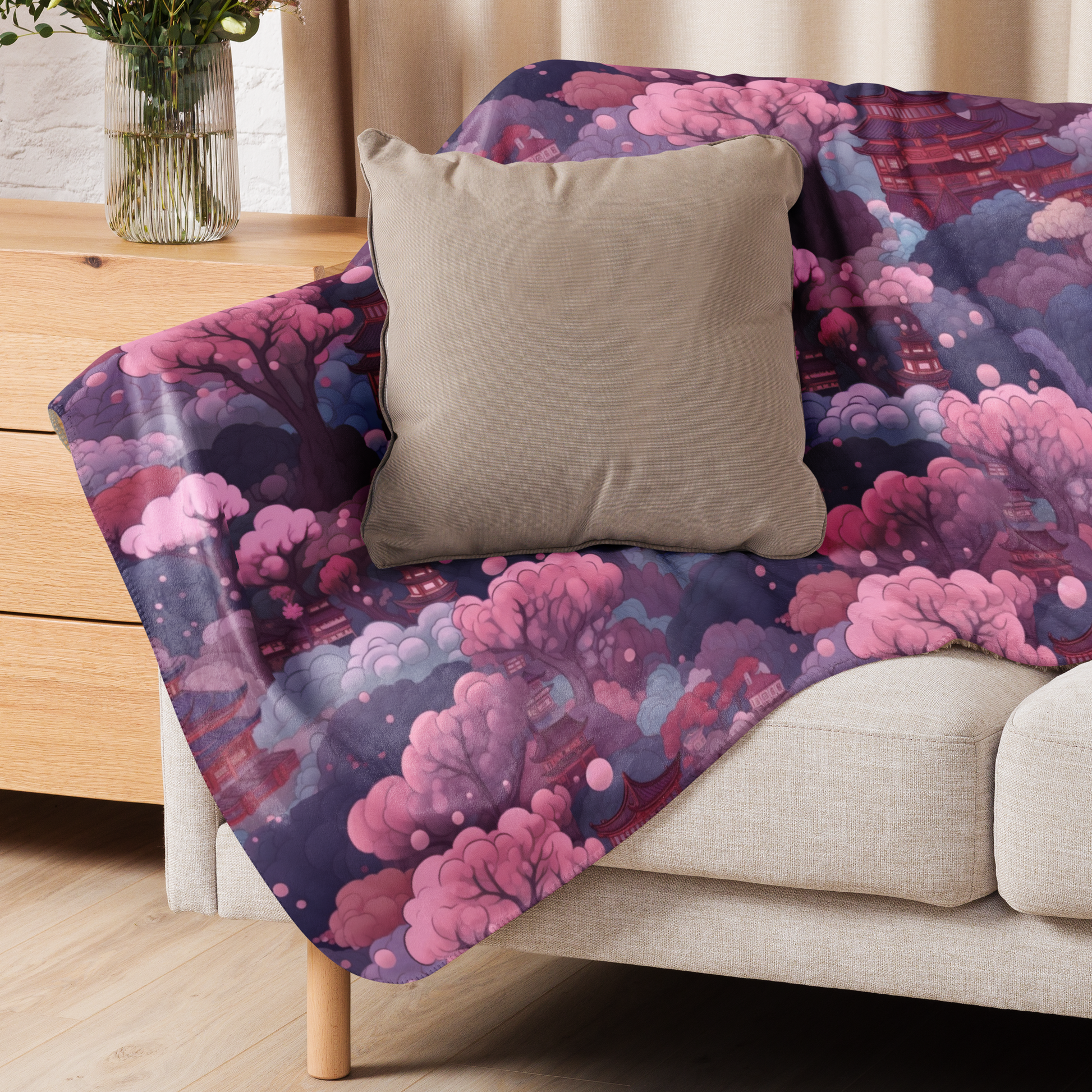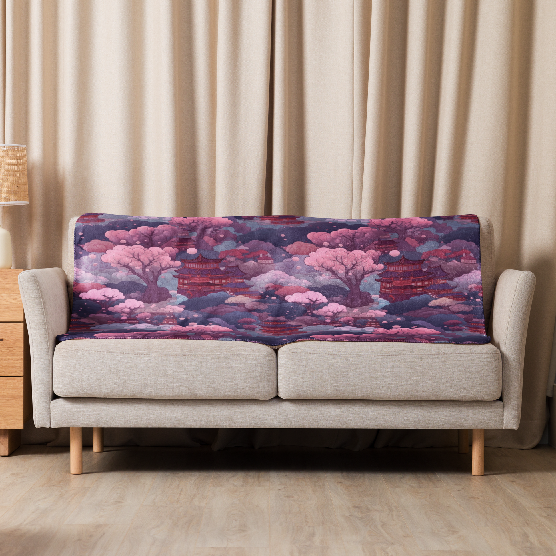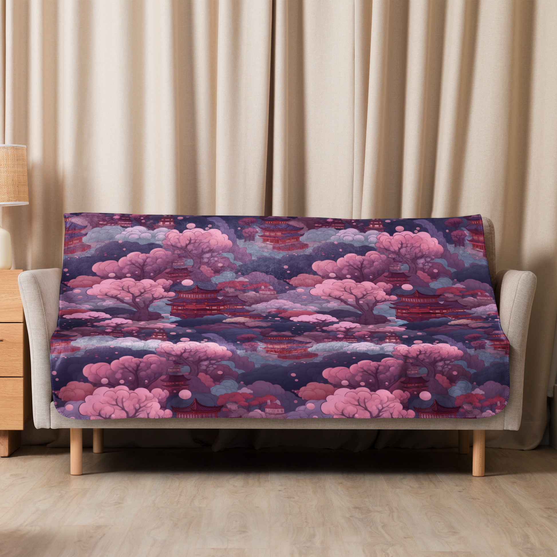 Stel je voor dat je jezelf omhult met deze zachte, verfijnde deken, versierd met het betoverende tafereel van Sakura bomen onder de zachte gloed van de maan. Het is alsof je de essentie van een rustige Japanse tuin bij nacht vastlegt.